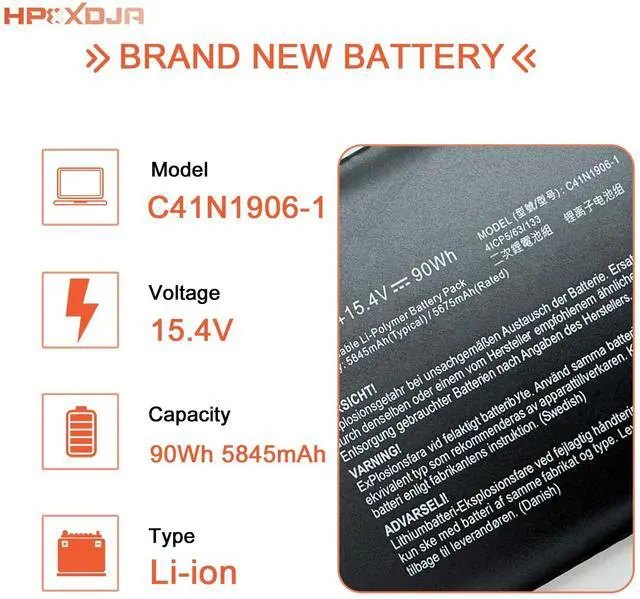 Battery Specifications C41N1906-1 battery for ASUS. Battery Type: Li-ion. Capacity: 90Wh 5845mAh. Voltage: 15.4V. WHAT YOU GET: 1 * C41N1906-1 battery. 1 * User Manual. 4 * Screwdrivers.
