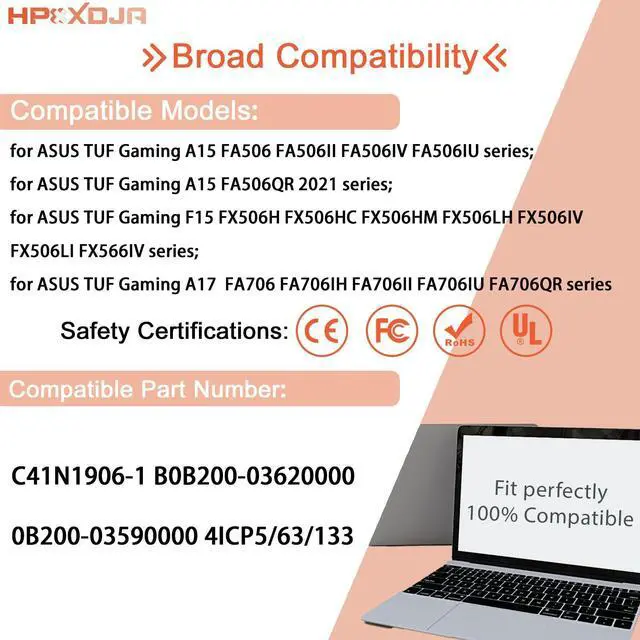 Compatible with C41N1906-1 battery. Fit for ASUS TUF Gaming A15 FA506 FA506II FA506IV FA506IU series; Fit for ASUS TUF Gaming A15 FA506QR 2021 series; Fit for ASUS TUF Gaming F15 FX506H FX506HC FX506HM FX506LH FX506IV FX506LI FX566IV series; Fit for ASUS TUF Gaming A17 FA706 FA706IH FA706II FA706IU FA706QR series notebook.