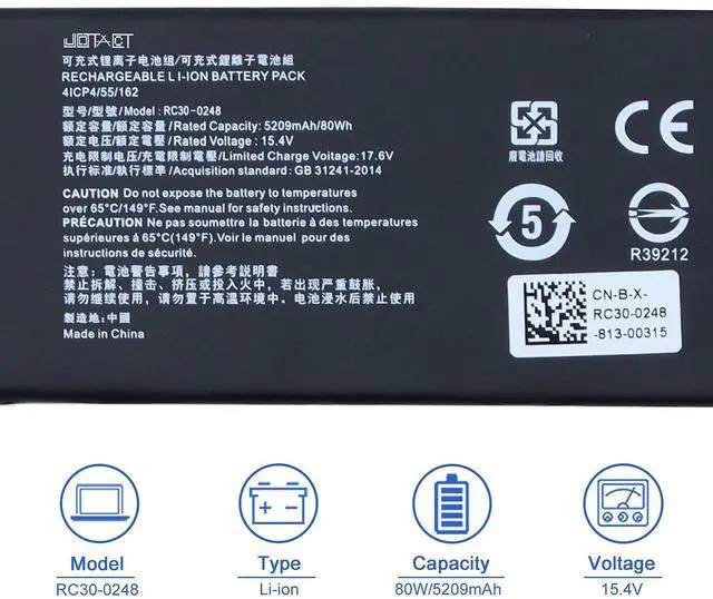 SpecificationsItem Model: RC30-0248; Product Type: Replacement battery; Battery Type: Li-ion; Number of cell: 4 cell; Voltage:15.4V; Capacity: 80Wh/5209mAh; Battery Life: Up to 500 recharge cycles over the life of the battery.