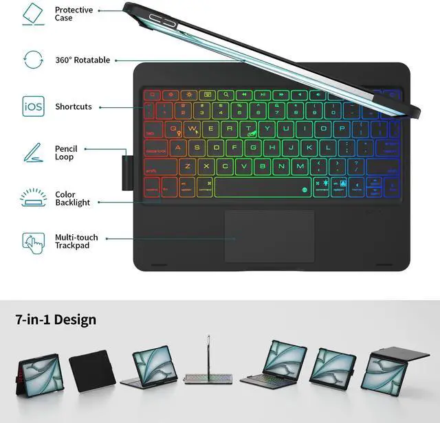 VERSATILE DESIGN: 7-in-1 keyboard case with 360° rotation capability allows multiple viewing angles and usage modes for typing, viewing, reading, and drawing