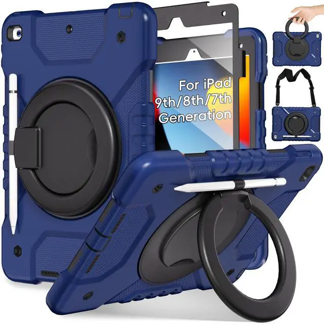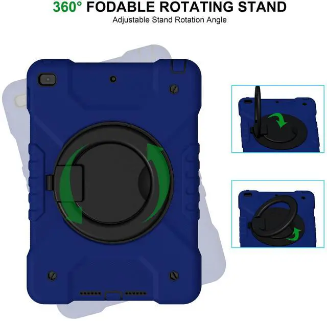 Andnary Case for iPad 9th/8th/7th Generation 10.2 inch, Heavy Duty Shockproof Cover with 360° Rotating Handle/Bracket/Pen Holder/Shoulder Strap, Kids Case for iPad 2021/2020/2019 (Navy+Black)