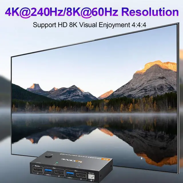 KVM Switch Displayport 2.1 for 8K@60Hz/4K@240Hz Visual EnjoymentKCEVE Displayport 2.1 KVM switch 2 ports compliant with DisplayPort 2.1 supports high resolution up to 8K@60Hz, 4K@240Hz, 4K@144Hz, 4K@60Hz, 1080P@240hz, makes the screen display more delicate and realistic. The final resolution also depends on the monitor, graphics card, cables and adapters. Please Note: Using displayport 2.1 cables will solve the problem of flickering and black screen