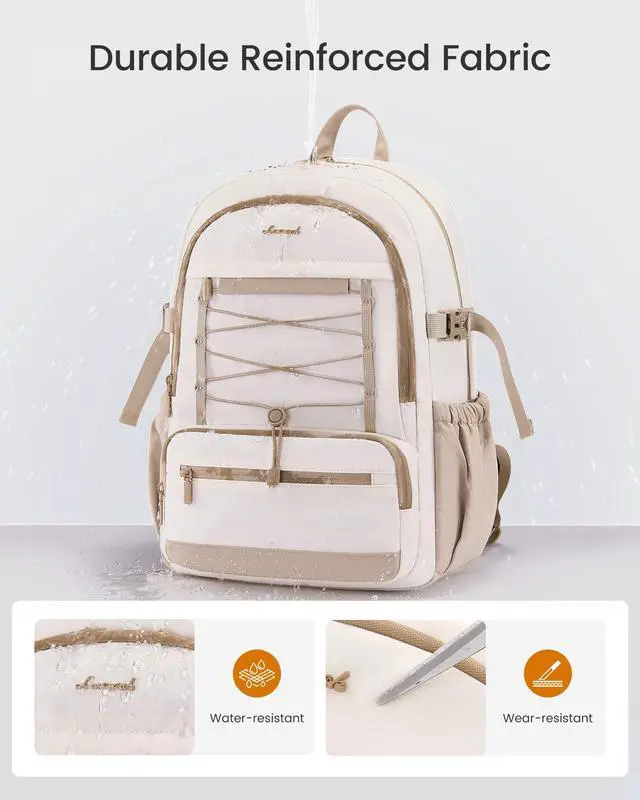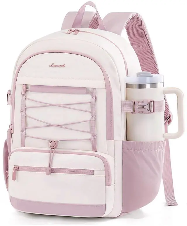 LOVEVOOK School Backpack for Teen Girls, Large Capacity College Student Backpacks with Water Bottle Holder, Cute Laptop Backpack Purse for Women, Lightweight Casual Travel Backpack, Beige-pink