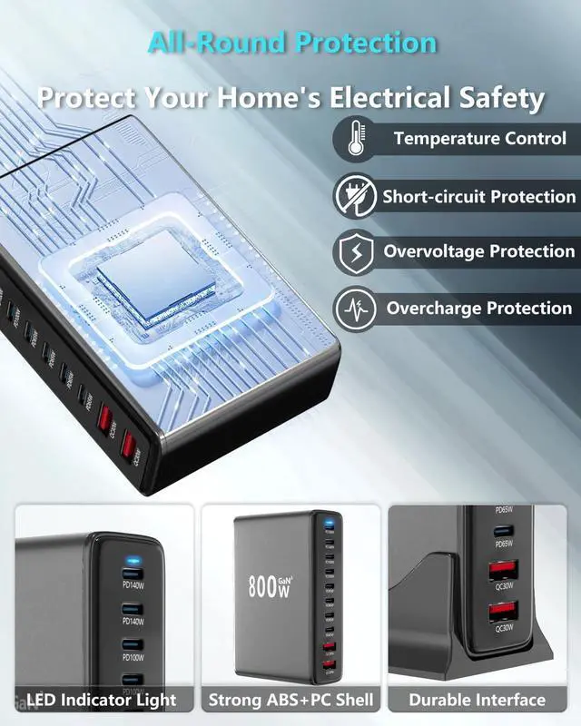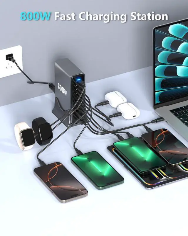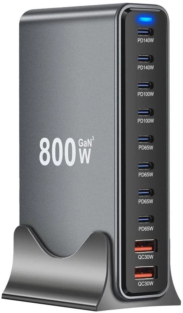 High-Power Multi-Port Design for Simultaneous Device Charging This 10-port GaN (Gallium Nitride) charger delivers 800W total output power, with 2 ports supporting up to 140W each for high-demand devices like laptops (e.g., MacBook Pro 16 M1 Max) and gaming consoles. The remaining 8 ports provide flexible power allocation (up to 65W per port), enabling simultaneous charging of smartphones, tablets, and peripherals. Its PFC+LLC hybrid architecture optimizes power distribution, ensuring stable voltage and current delivery even under heavy loads. Ideal for households or offices with multiple devices, this charger eliminates the need for bulky adapters and reduces clutter.