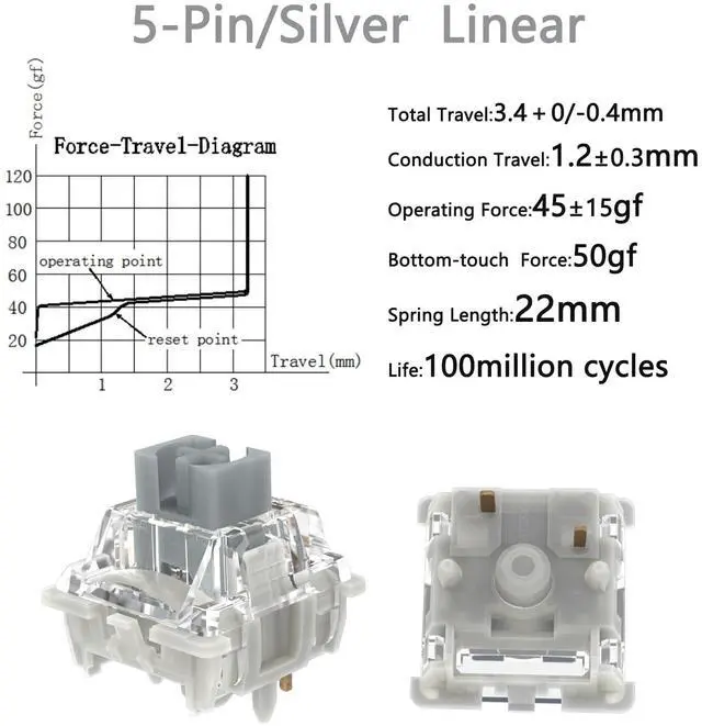 [Product parameters]:Gateron G Pro 3.0 Silver,Linear Switches,with smooth&consistent handling and low noise level;Total travel 3.4mm,Light Operating force-45gf;Great for gaming or typing.