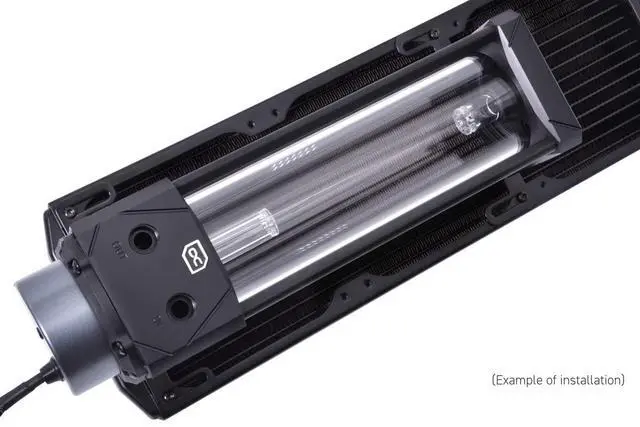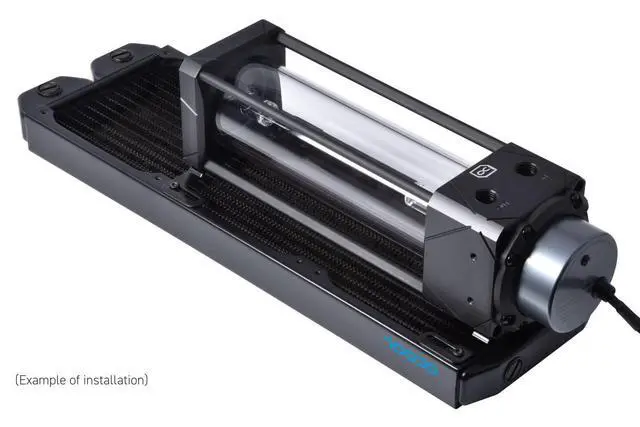 The mounting bracket allows Alphacool's Eisbecher reservoir to be mounted on all standard radiators with 120 mm fans. The 120 mm bracket allows for space-saving, easy placement of the reservoir in most cases and offers a variety of mounting options. Mounting exampleIn the front there is a radiator with fans installed so that the air pushes into the case. With the help of the mounting kit, the Eisbecher reservoir can be mounted on the back of the radiator to save space without affecting the airflow. This is only one possible example and you are free to use other mounting options.