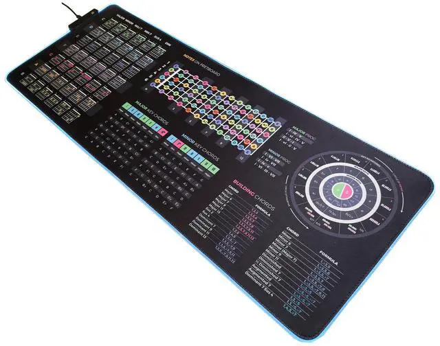 42 must-know chords with clear diagrams Full fretboard note chart Popular chord progressions and in-key chord groupings Circle of fifths, chord construction, and music theory layout Right-handed layout only Smooth neoprene surface with anti-slip backing