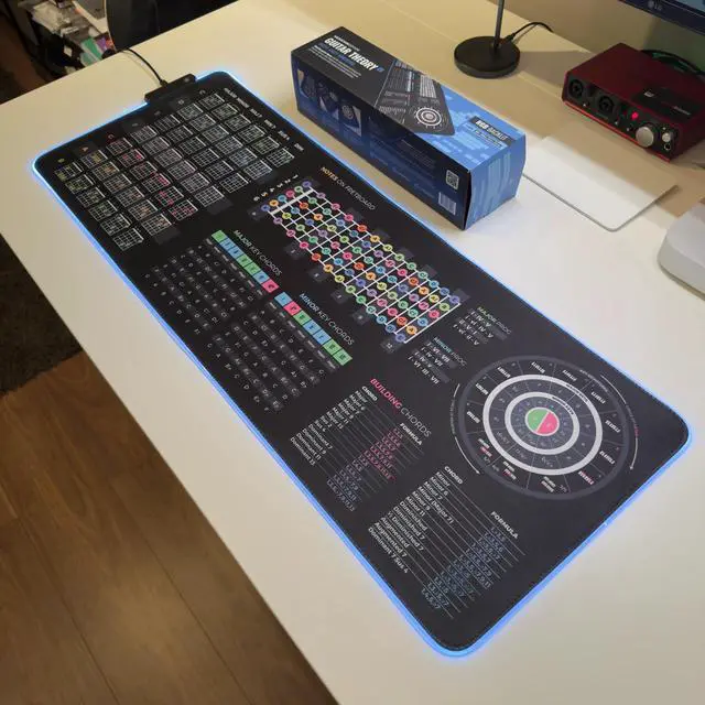 Elevate your guitar skills with the Guitar Theory Cheat Sheet Mousepad a visual learning tool designed to help you understand chords, scales, and theory concepts faster.