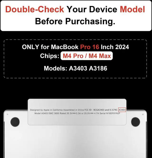 ONLY compatible with new MacBook Pro 16 inch 2024 release with M4 Pro / M4 Max Chip (Models: A3403 A3186). Not fit the old model A2141 in 2019. Pls check Model No. on the underside of MacBook before purchasing.