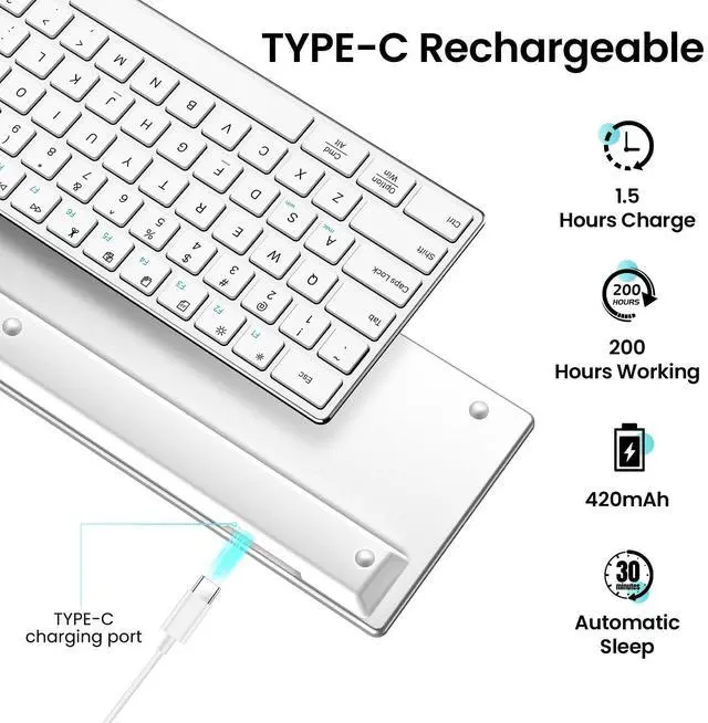 Rechargeable Battery Design: Built-in 420mAh rechargeable Lithium-ion battery lasts up to 3 months with no need to replace battery. And it can recharged with the included USB cable. It features an environmentally friendly auto-sleep mode. Click any key to wake it up after 30 minutes of inactivity.
