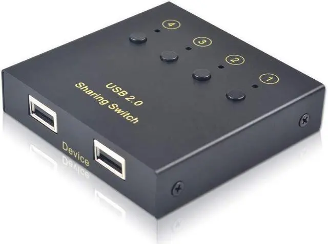 This 4 Port USB Sharing Switch allows button swapping between 4 computers to share 2 USB 2.0 peripheral devices without constantly swapping cables or set up complicated network sharing software;
