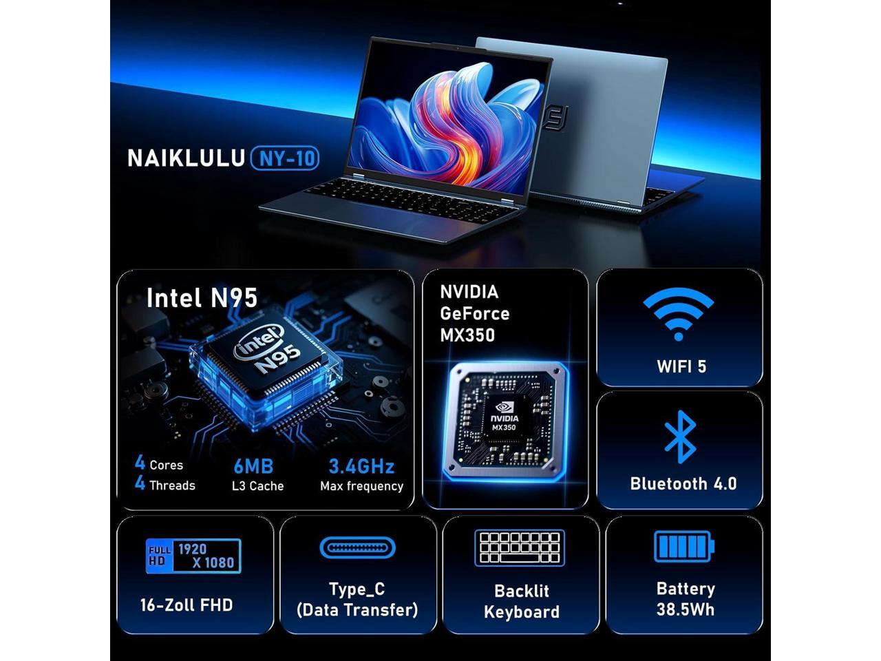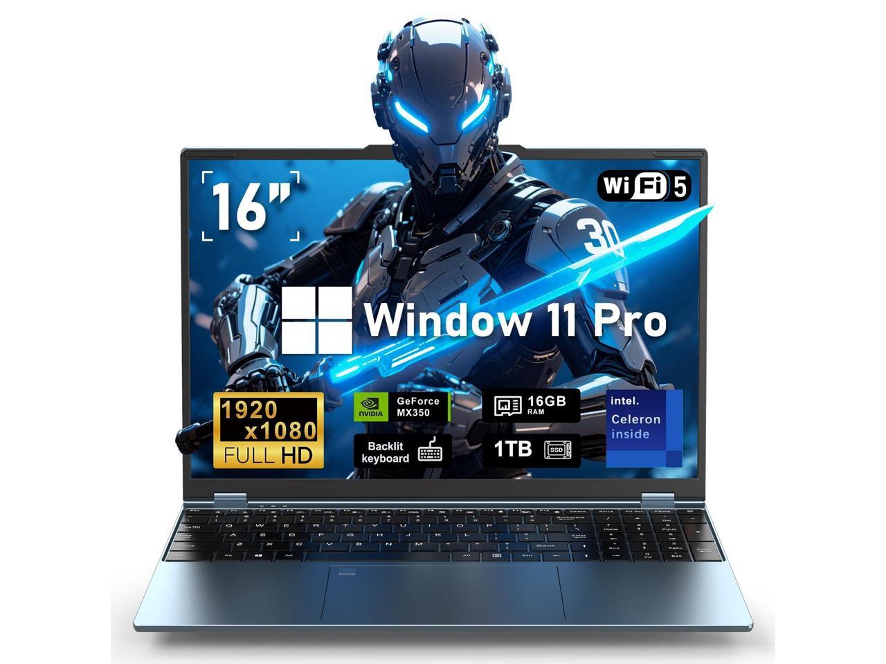 NAIKLULU Gaming Laptop,Laptop Computer 2025,Win 11 Pro 16 Inch Lap Top,16GB RAM 1TB SSD PC,MX350 Graphics,N95 4C/4T Processor(up to 3.4Ghz),Backlit Keyboard,16FHD 1920 * 1200 Display,WiFi 5,BT4.0