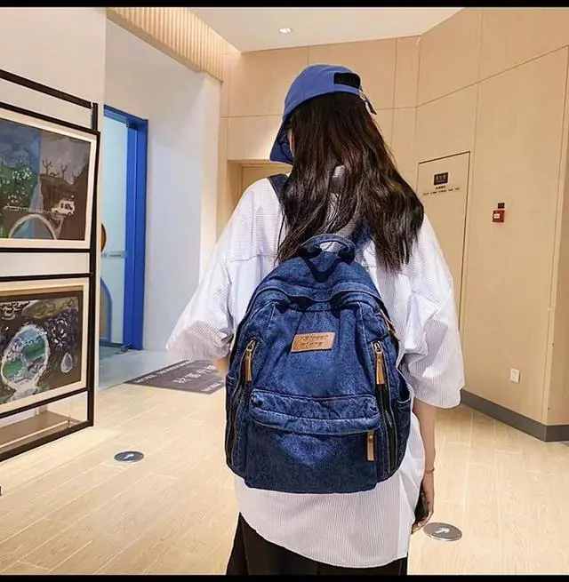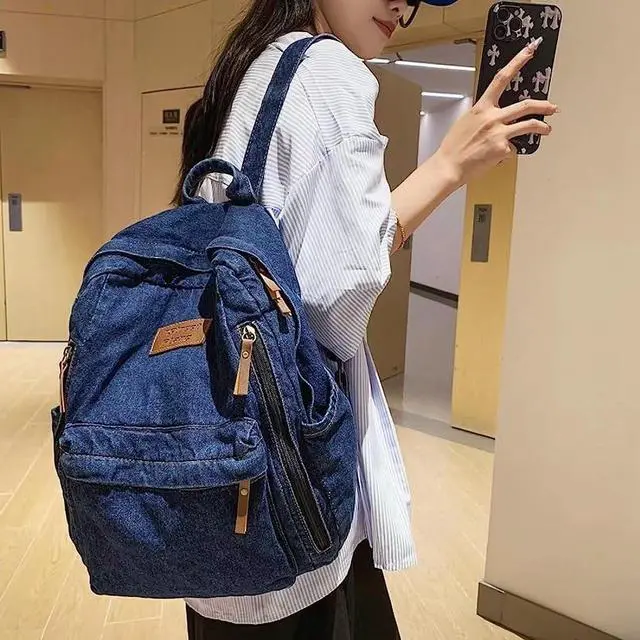KAOBIO Denim Backpack for Women Men Vintage Grunge Backpack Blue Jeans Laptop Backpack Retro Rucksack for Travel Work (Navy, One Size)