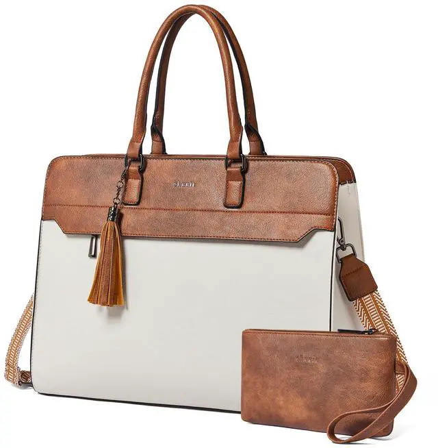Shrrie 17 inch Laptop Bag for Women, Water-Resistant Work Bag LaptopTote Bag, Professional Business Tote for Office, Travel, College-Fits 15.6 Laptop&Tablet, Briefcase with Satchel Purse, Beige with Brown