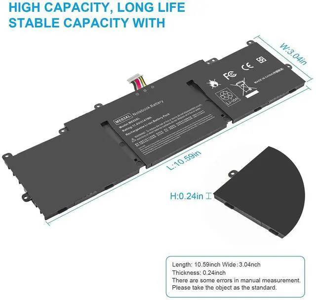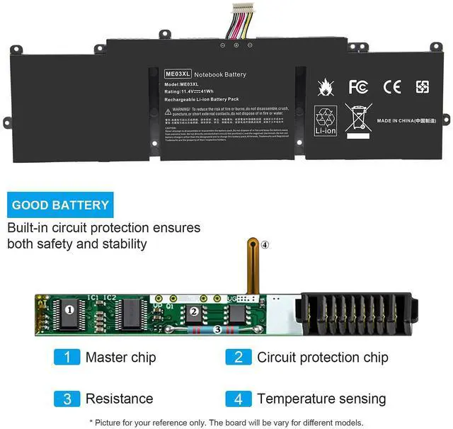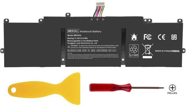 SpecificationsBattery Model Name: ME03XL. Voltage: 11.4V. Capacity: 41Wh. Cells: 6-cells.Type: Li-ion Battery. Battery life: Up to 500+ recharge cycles over the life of the battery.