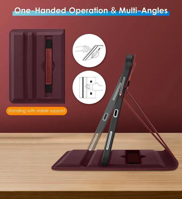 Internal embedded 360-degree rotating design, flexible rotation to any angle for comfortable watching movies or typing. Built-in leather hand strap (one-handed operation)