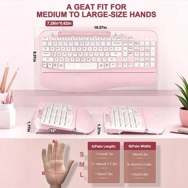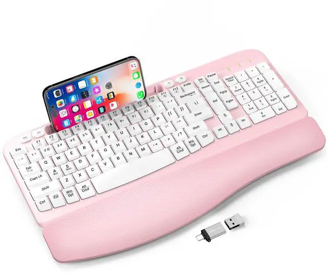 Ergonomic Wireless Keyboard with Cushioned Wrist Rest, Wave Keys, Phone Holder, Comfortable Natural Typing, 2.4GHz Full Size Cordless USB Computer Keyboard for Windows, Mac OS, Laptop, PC (Pink)
