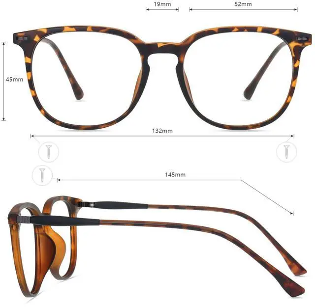 Product Dimensions: Medium Glasses: Weight:13g, Frame Width: 52mm(2.05in), Frame Height: 45mm(1.77in), Temple Length: 145mm(5.71in), Nose Bridge: 19mm(0.75in)
