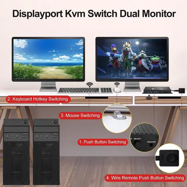 Displayport kvm switch 2 monitors 2 computers 4k 144hz,kvm switch 2 monitors 2 computers display port kvm Switch 2 Monitors 2 Computers displayport 4k 240hzThis displayport kvm switch dual monitor 2 computer 144hz helps you to Hook up 2 computers to share one set of keyboard, mouse with hotkey,and there are three modes ,videowall,dual extended or mirrored monitors, with 4 extra high speed USB 3.0 hub port for sharing USB peripheral; Perfect for IT specialist, gaming(with high Frame), and other multi tasks, dual monitor kvm witch displayportdisplayport kvm switch dual monitor