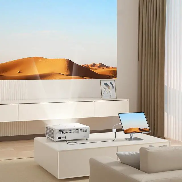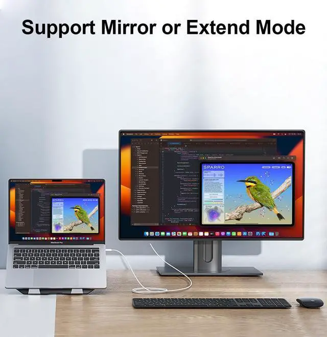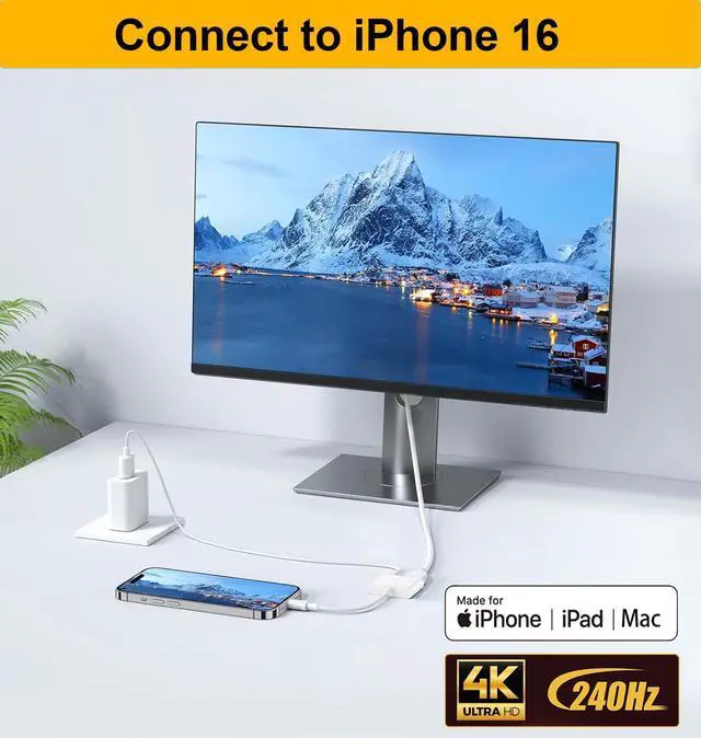 It supports mirroring/extending the screen of your iPhone 15/16/computer/Macbook/iMac/iPad Pro/smartphone (including apps, videos, pictures, presentations, websites, slideshows and more) to your HDMI-enabled TV, monitor, projector.