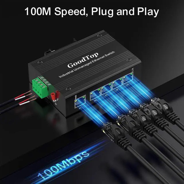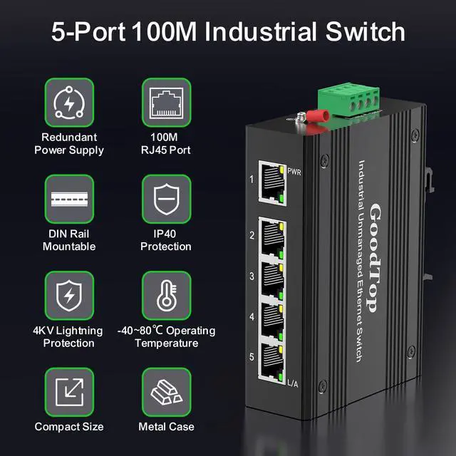 GoodTop 5 Port 100Mb Unmanaged Industrial Switch with DIN Rail 15W Power Supply, 10/100Mbps Fast Ethernet, IP40, 4KV Lightning Protection, Operating Temperature Range -40° 80°C DIN Rail Network Switch