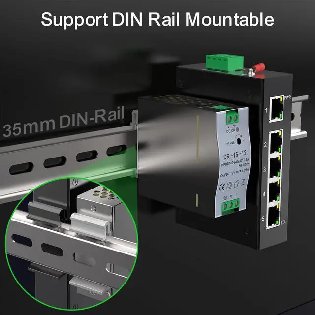 Aluminum AlloyThe shell of this switch is made of industrial grade aluminium alloy which provides greater robustness,better heat dissipation. Supports 35mm DIN Rail mounting,installation and disassembly are very simple.