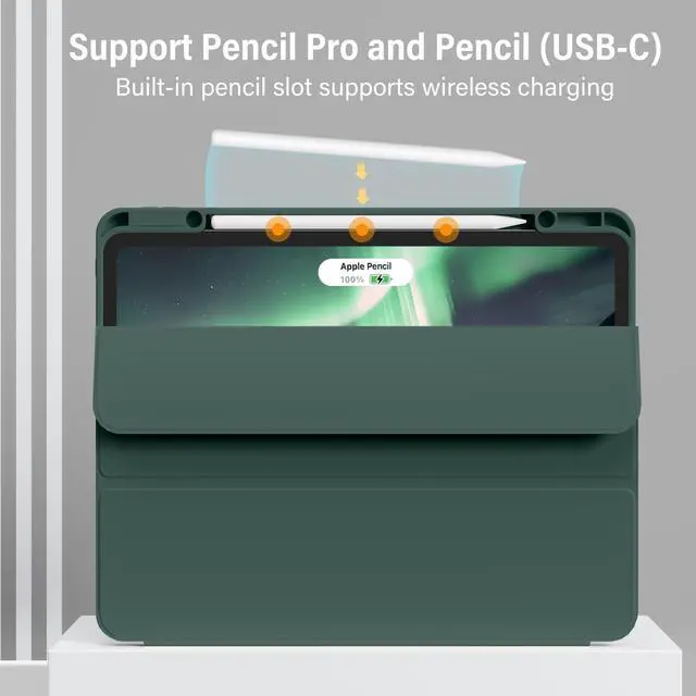 Built-in Pencil HolderThis iPad Pro case fully supports Pencil Pro and Pencil (USB-C) with a recessed side groove for magnetic charging and a magnetic clasp to keep your Pencil secure.The built in Pencil Holder can hold your apple pencil in place tightly, conveniently store and remove your pencil. Effectively prevent falling out, reduce the likelihood of losing your pencil.(Apple Pencil is Not included)