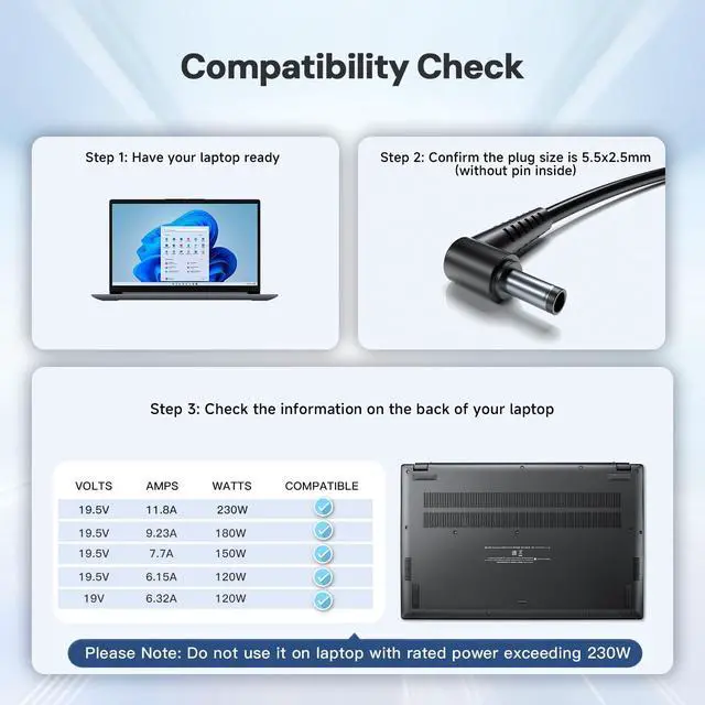 The Dongerdi 230W Laptop Charger delivers 19.5V 11.8A output for fast and stable charging of high-performance Eluktronics gaming laptops. Featuring a 5.5 × 2.5 mm round connector, it is compatible with Eluktronics MAG 15, MAX 15, and Mech 15 models. With universal 100240V input (5060Hz), it offers reliable performance for home, office, and international travel. Built-in safeguards protect against overcurrent, overvoltage, and short circuits. A total 10-foot cable length (6-foot charger cord plus 4-foot power cord) provides flexibility for convenient charging, while the compact and lightweight design ensures easy portability.