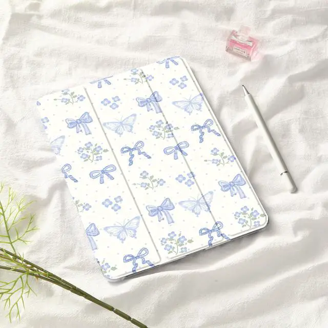 Idocolors Cute Kawaii Blue Bow Butterfly Pad Case for 10.2 Inch iPad 9th/7th/8th Generation, Clear TPU Smart Stand Back Cover with Pencil Holder, Auto Wake/Sleep iPad 2021/2020/2019 Case