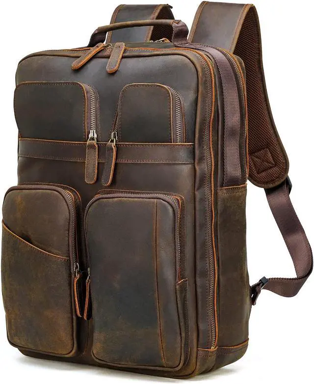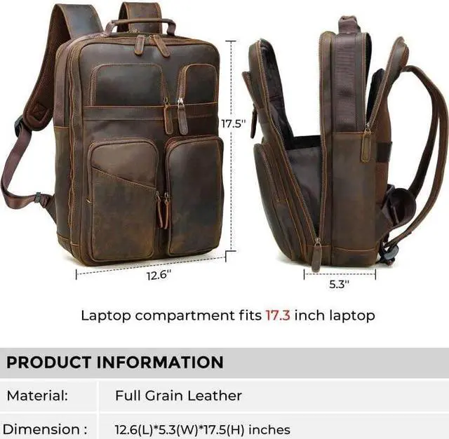 compalo Full Grain Leather Backpack for Men, 17.3 Inch Travel Laptop Backpack Multi Pockets DayPack Rucksack With YKK Zippers