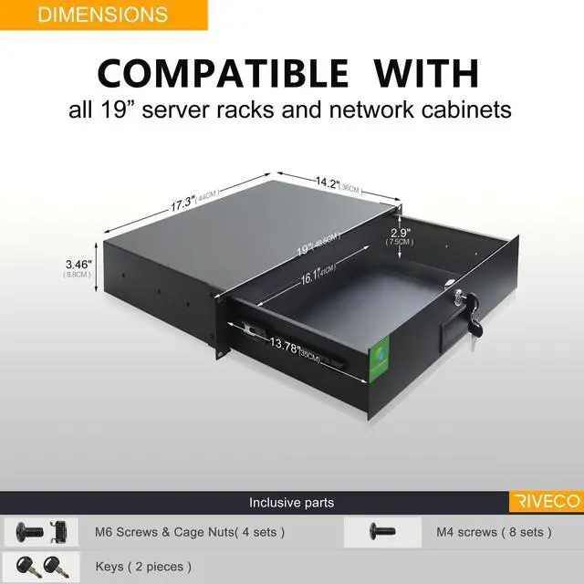 RIVECO 2U Rack Drawer Rack Mount Drawer for 19 Network Equipment & Server Rack Cabinet Lockable Deep Drawer with Key Black
