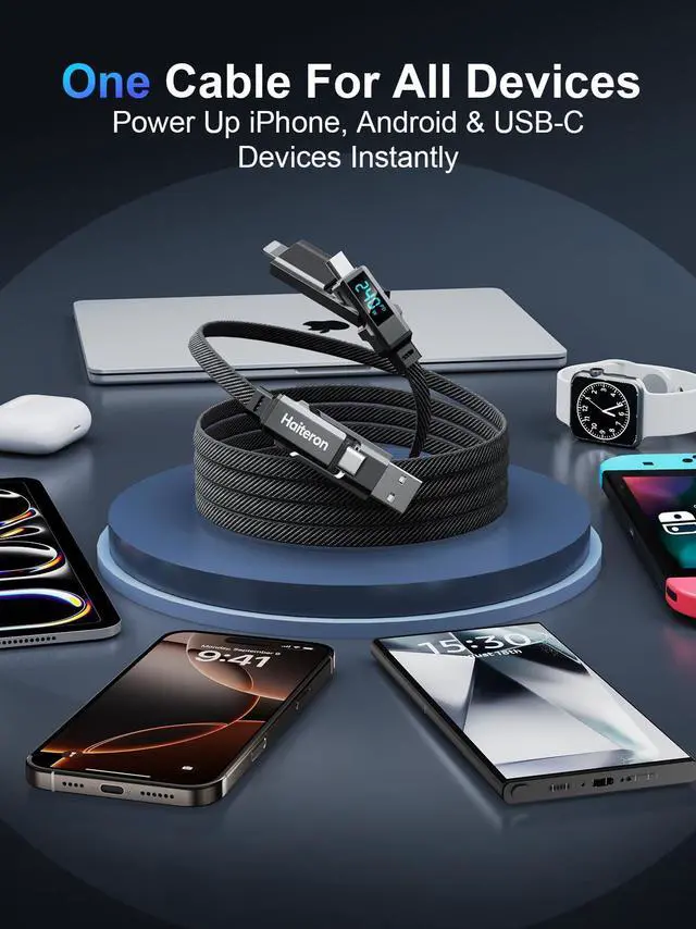 [One Cable, Charge Everything: Universal 4-in-1 Design] Ditch the cable clutter! Haiteron's flat braided cable packs 4 essential connectors in one: USB-C to USB-C, USB-C to Light-ing, USB-A to USB-C, and USB-A to Light-ing. Effortlessly power and connect your iPhone 16/15/14, iPad, Samsung Galaxy, MacBook, iPad, and more. Your ultimate all-in-one charging solution for travel, work, or home.