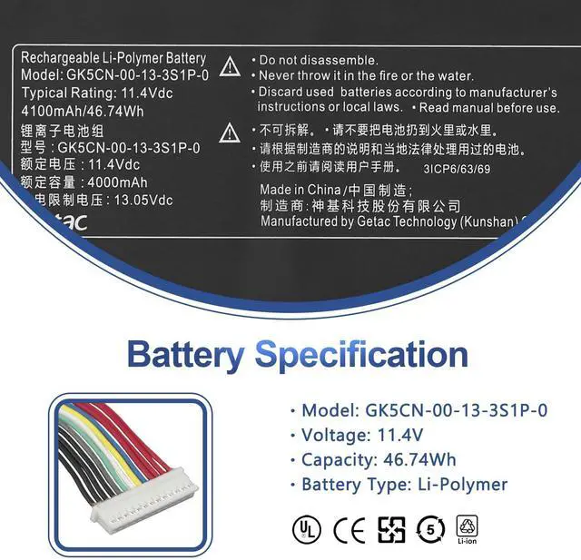 GK5CN-00-13-3S1P-0 46.74W h Laptop Battery Replacement for Getac TONGFANG GK5CN4Z GK5CN5Z GK5CN6Z GK5CQ7Z GK6Z5CN GK7CN6S Series GK5CN-00-13-4S1P-0 11.4V 4100mAh