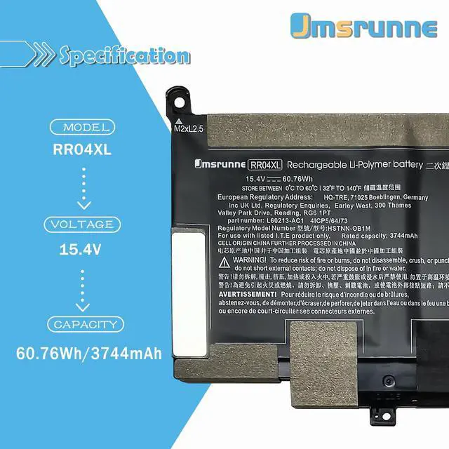 HP RR04XL Specifications Model: RR04XL ./ Voltage: 15.4V ./ Capacity: 60.76Wh /Battery type: Li-ion. /Battery life: Up to 1000 recharge cycles over the life of the battery. Also comes with installation tools.Purchasing Note: Due to the complexity of laptop battery models, you may not be able to accurately determine the model you need to purchase,Please open the back cover of the laptop to confirm the original battery model number