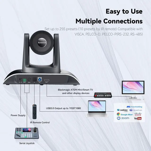 / Tenveo PTZ Conference Camera can be controlled remotely to rotate 350° (±175°) horizontally and 180°(±90°) vertically in an accurate, smooth and silent way. It is also supportive of 10 presets setting through the IR Remote Control and is available to set up to 255 presets via RS232 and RS485 interfaces for professional control. The convenient way could quickly control the PTZ camera pan, tilt, zoom, and move to the preset position for close-up sequence