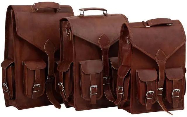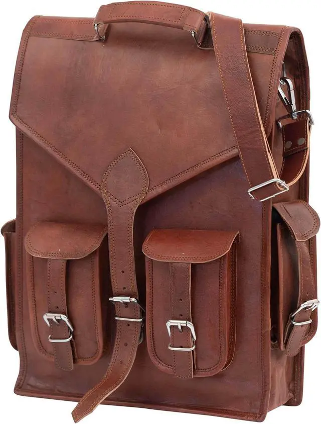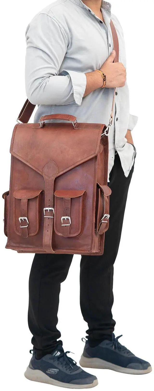 A perfect companion for your college office and other use - Made with Hands Genuine leather messenger backpack Going office or collage need something to carry all your essentials like laptop, files, folder and belonging and to keep them at one place our leather laptop bag is perfect for all your needs Laptop padding to keep laptop safe. Unisex leather laptop backpack messenger bag satchel in dark brown. This original handmade leather messenger bag or leather laptop bag is created by finest Indian artisans with all the attention to detailing. The messenger backpack is made of genuine leather. You will receive exactly same bag as shown, no foul smell as it comes in other goat leather bag. fits laptops, tablets and devices up to 14 inches