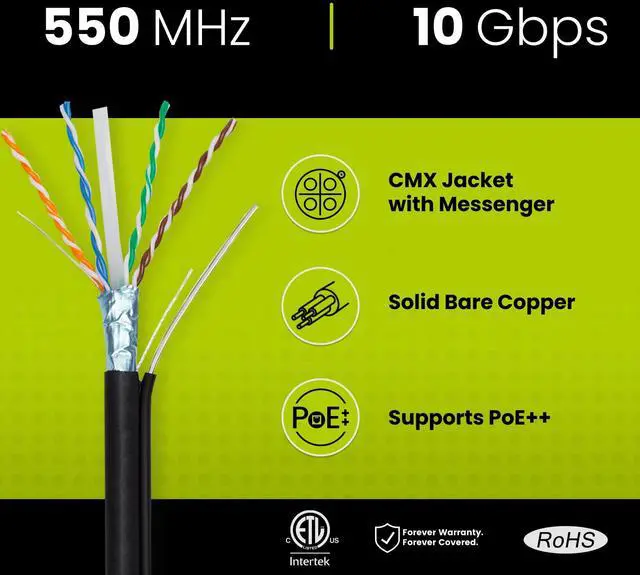 [Extreme Performance] The built-in 16AWG steel messenger makes this ideal for aerial runs. Overall aluminum (AL) foil shield - F/UTP reduces electromagnetic interference (EMI) and supports speeds 1 & 5 Gigabit up to 328ft and 10Gb up to 165ft.