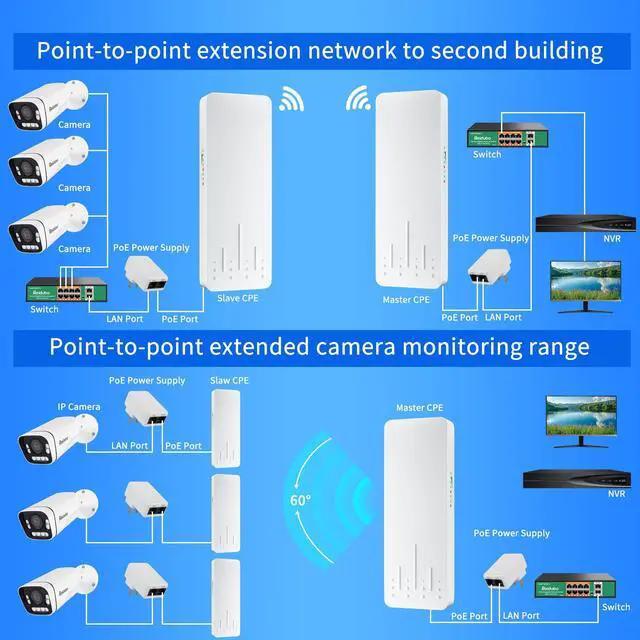 Easy Setting & Multiple Operation ModesThe wireless bridges are pre-pared. Plug-and-play to easy installation. No app or PC required for setup. They support Point-to-Point and Point-to-Multipoint connections. Expand your network to large areas s