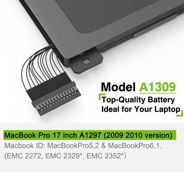 Compatible with Laptop ModelsOnly Fit for A1308 A1297 MacBook Pro 17" (Early 2009, Mid-2009, & Mid-2010) [Macbook ID: MacBookPro5,2 & MacBookPro6,1. ] (NOT FIT FOR:MacBook Pro 17" A1383 A1297 2011 Version battery)