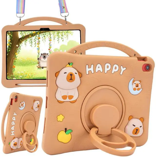 YOUSIDUN Capybara Kids Case for iPad (A16) 11th Generation 11 inch 2025 / iPad 10th Gen 10.9" 2022-3D Cute Silicone Cover for Girls with 360° Rotating Stand, Adjustable Strap, Pencil Holder-Brown