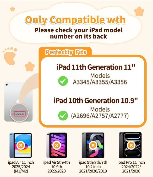 CompatibleThis cute cartoon tablet case is exclusively designed for iPad (A16) 11th Generation 11 Inch 2025 (Model Number: A3354 / A3355 / A3356), iPad 10th Generation 10.9 Inch 2022 (Model Number: A2696 / A2757 / A2777 / A3162). Not compatible with any other devices, Please confirm your tablet model number before purchasing