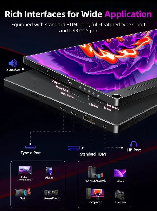 Richest Digital Video Interfaces on UPERFECT: The only one Brand that equipped with standard HDMI and 2 Type C port at same time, meet your multiple needs; Compared to mini HDMI, standard HDMI port has more advantages in terms of compatibility,transmission bandwidth and connection stability; 2 Type-C port enables you to power and transmit video with just one cable connection (Note:4K monitor needs to be powered when connect to phone)