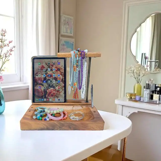 Built-In Tray with Pen & Pencil Holder: Integrated tray keeps essentials like keys, coins, pens, and pencils neatly arranged. This Acacia wood stand functions as both a headphone holder and a wooden desk organizer, blending beauty and utility.