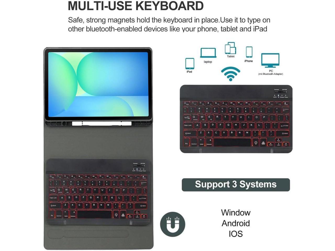 - Wireless 7-Color Backlight KeyboardOur for Samsung Galaxy Tab S10 Lite/S10 FE/S9 FE 10.9''/Galaxy Tab S9 11'' Bluetooth backlit keyboard has 7 adjustable backlight colors and breathing light backlight mode that switches automatically. The keyboard can be used in the dark, ensuring clear visibility and matching your mood and environment in any lighting conditions.