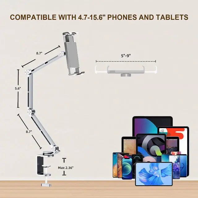 Universal CompatibilityThis sliver tablet holder comes with a retractable clip that perfectly fits 4.7"-15.6" devices including iPad Pro 11/13 inch, iPad Air 11/13 inch, iPad 10/9th Gen, iPad Air 4/5, iPad mini 5/6, Samsung Galaxy Tab S9/S9+ Plus/S9 FE/S9 FE+/S9/S8/S8+/S8 Ultra/A9+/A8/S7/S6/S6 Lite series, Kindle Fire HD 10/8, Surface Pro 9/8/7. Wide groove design (compatible with thickness 0.55in/14mm) ensures easily fixed even with a protective case, without the need for repeated disassembly.