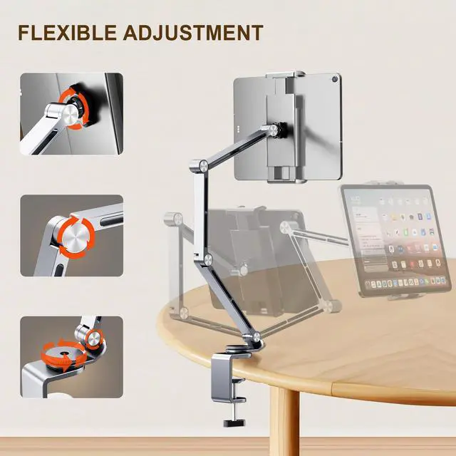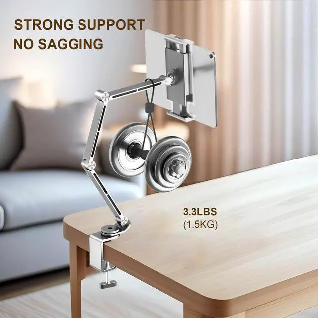 Heavy-Duty Stability Unlike wobbly gooseneck stands, our sliver tablet stand features reinforced aluminum alloy joints and ungraded damping design, which provide stable support for your most large devices/portable monitors with a maximum load capacity of up to 3.3lbs/1.5kg (such as iPad Pro).The C-clamp boasts soft silicone pads to prevent scratches and slipping during use.