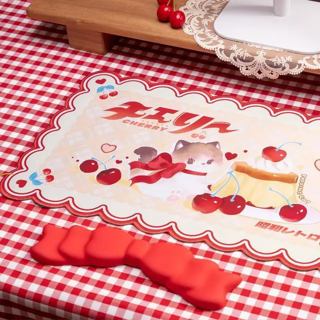 The set includes a cat-shaped wrist rest and a milk tea-shop-themed mouse pad, both of which are designed to add a touch of cuteness and personality to your workspace.