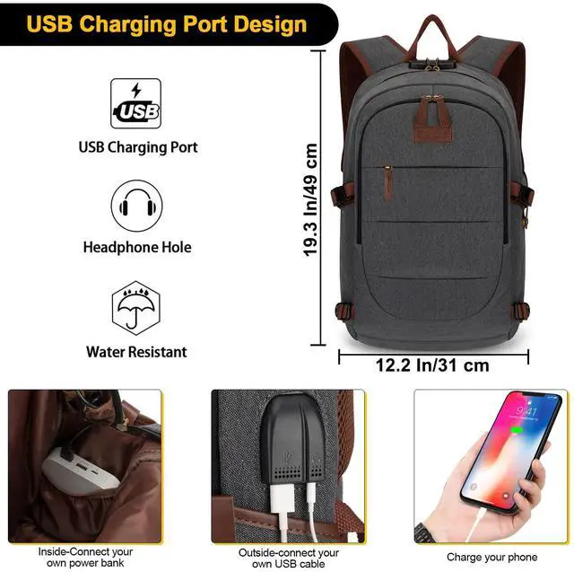[USB and Headphone Port] This backpack has external USB port with built-in charging cable offers convenient charging your cellphone by connecting your own power bank. The headphone port outside gives easy access to Earphone usage as well. (battery pack NOT included).