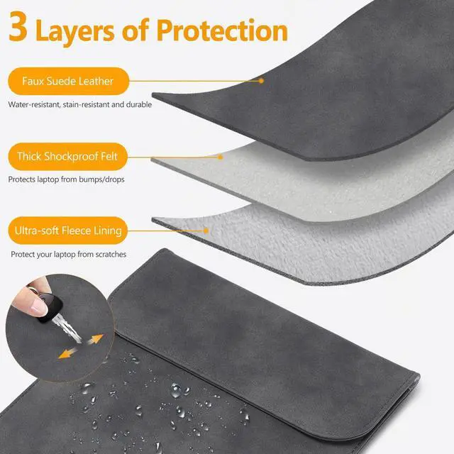 Made of High-strength and durable Microfiber (Faux) Suede Leather, water-resistance, and anti-scratch. Soft velvet lining protects your laptop from scratches when you take it out or put it in the sleeve