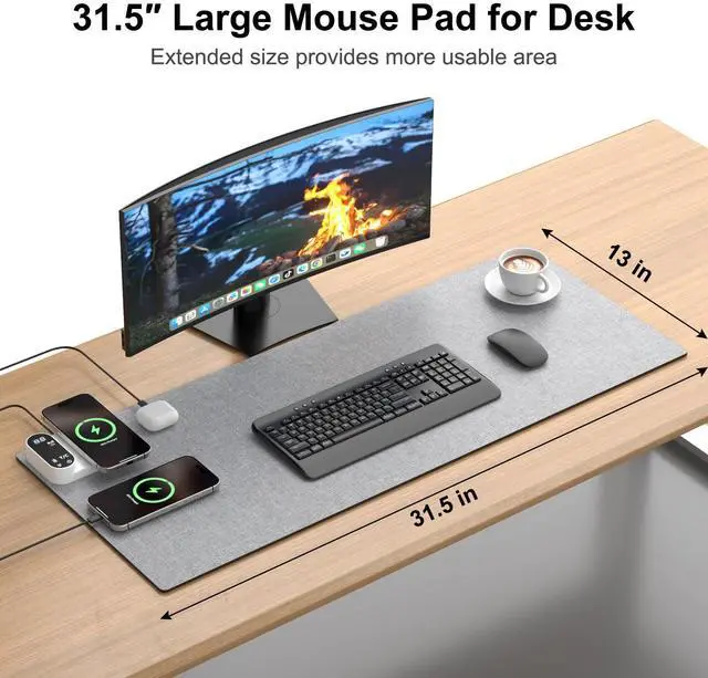 Heated Mouse Pad with 3-in-1 Charging (15W Magnetic Wireless + Type-C + USB-A), Waterproof Warm Desk Pad, 26H Auto-Stop Heating, Fabric & PU Leather Office Desk Mat, Large 31.5" x 13" (Grey)